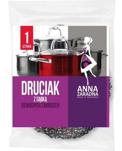 - Anna Zaradna Druciak z Gąbką to funkcjonalne narzędzie do czyszczenia, które łączy druciak i gąbkę. Druciak skutecznie usuwa trudne zabrudzenia, przypalenia i tłuszcz, a gąbka delikatnie czyści powierzchnie bez ryzyka zarysowań. Dzięki ergonomicznemu uchw